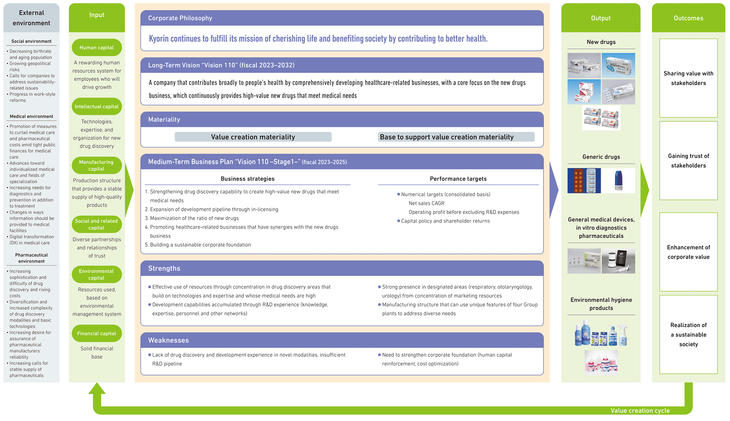 Following our corporate philosophy that states “Kyorin continues to fulfill its mission of cherishing life and benefiting society by contributing to better health,” the Kyorin Group is carrying out business activities aligned with our long-term vision, materialities (important issues), and medium-term business plan.