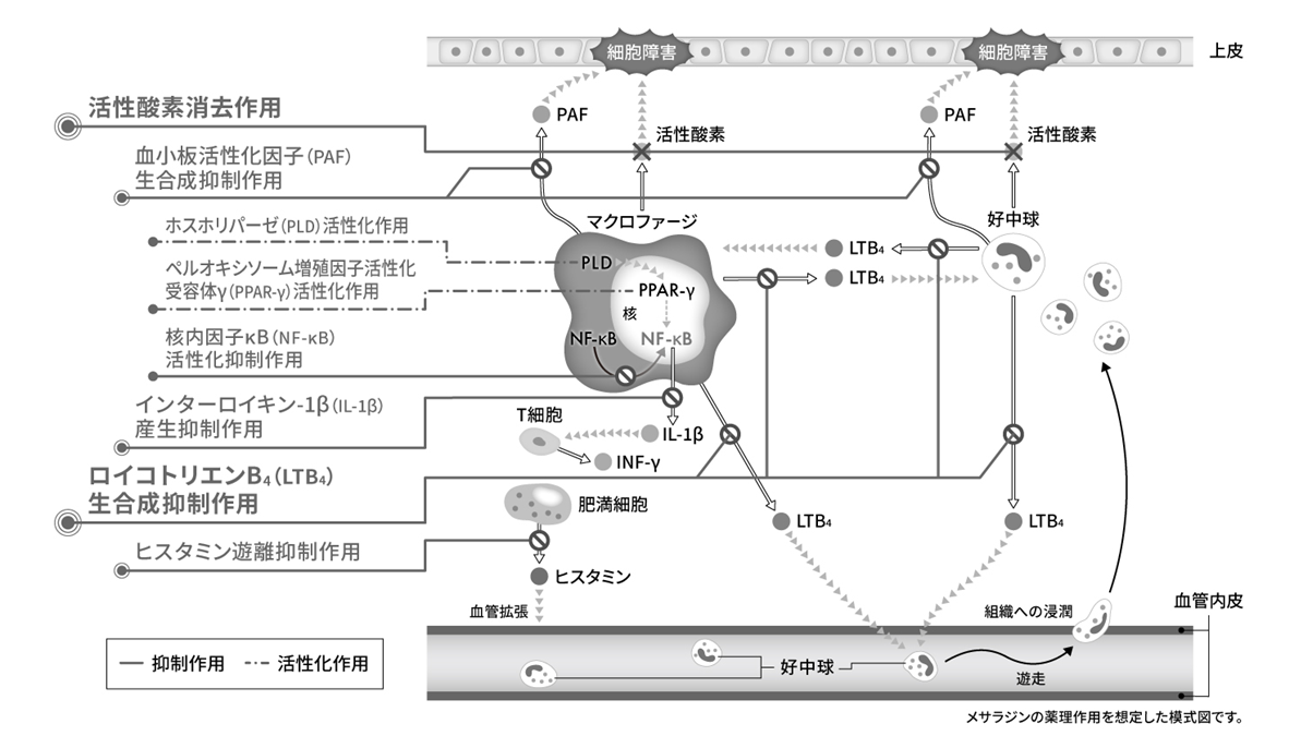 したがって、メサラジンはLTB4の生合成抑制作用、更に活性酸素消去作用を介して炎症性細胞の浸潤を抑制し、炎症の進展を阻害すると推察されています。